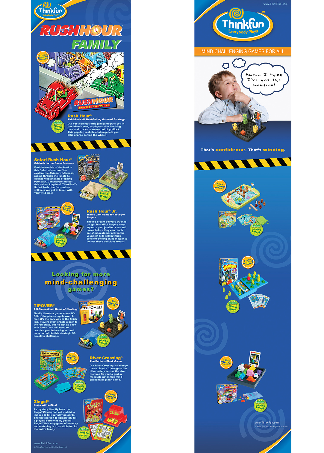 One of the banners was to display a range of Rush Hour Family products, while the other banner was for the Thinkfun brand message, with over half of banner to be hidden behind merchandise. Taking inspiration from Thinkfun's previous marketing documents, the products banner was designed and quickly approved. Each product image had to be painstakingly masked out of their background to be used within the banners.